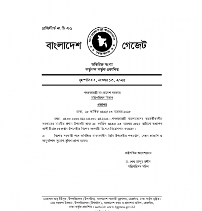 বৃহস্পতিবার (১৩ নভেম্বর) মন্ত্রিপরিষদ বিভাগ থেকে এ সংক্রান্ত প্রজ্ঞাপন জারি করা হয়েছে। এতে সই করেছেন মন্ত্রিপরিষদ সচিব ড. শেখ আব্দুর রশীদ।