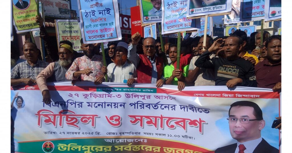 কুড়িগ্রাম-৩ আসনে (উলিপুর) বিএনপি মনোনীত প্রার্থী পরিবর্তনের দাবিতে সড়ক অবরোধ করে বিক্ষোভ ও অবস্থান কর্মসূচি পালন করেছেন দলটির একাংশের নেতাকর্মীরা। বৃহস্পতিবার উপজেলা শহরে এই কর্মসূচি পালিত হয়। ‘উলিপুরের সর্বস্তরের জনগণ’-এর ব্যানারে আয়োজিত এই কর্মসূচিতে স্থানীয় রাজনৈতিক কর্মী, ব্যবসায়ী, শিক্ষক-শিক্ষার্থী, দিনমজুর, কৃষকসহ বিভিন্ন শ্রেণি-পেশার মানুষ অংশ নেন।