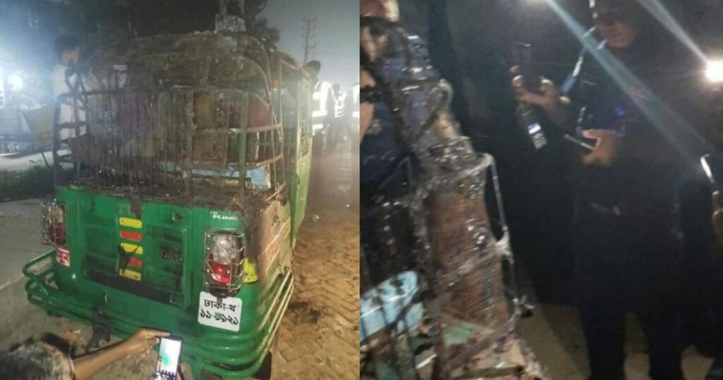 পরে স্থানীয়দের সহযোগিতায় চালক অটোরিকশার আগুন নেভান। কিন্তু ততক্ষণে অটোরিকশার ছাউনি আর পেছনের আসনটি পুড়ে গেছে।