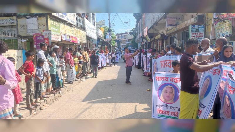মানববন্ধনে গোলাপীর বাবা ও মামলার বাদী বিষু মিয়া পুলিশের প্রতি তাঁর মেয়ের হত্যাকারীদের দ্রুত আইনের আওতায় আনা ও বিচারের জোর দাবি জানান।